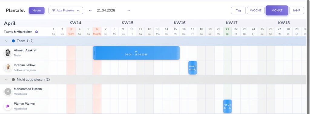 Mitarbeitende erscheinen in Teams (einklappbar). Unter „Nicht zugewiesen“ siehst du Kolleginnen und Kollegen ohne Team – hilfreich, um schnell freie Kapazität für neue Kundenaufträge zu finden.